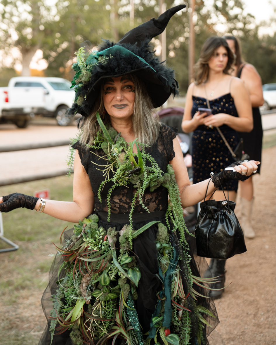 This year’s theme, Season of the Witch, was a love letter to the mystical. The yard shimmered with sequins and starlight, filled with friends who looked like they’d spilled straight from the Owens sisters’ attic trunk. There were disco witches, bog witches, pink witches, garden witches, rhinestone witches, rodeo ribbon witches, and every kind of spell-caster in between.